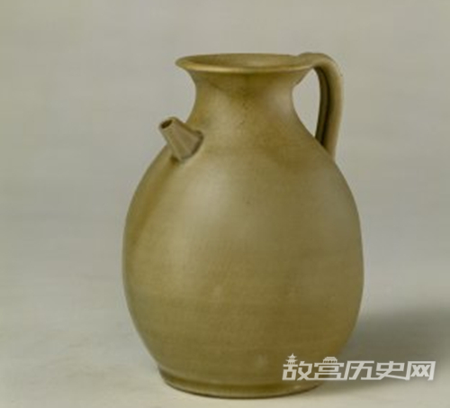 壶撇口,短颈,溜肩,鼓腹,浅圈足,圈足上留有五个支烧痕。颈部一侧置八棱短流,另一侧置曲柄。壶内外施釉,釉色青中闪黄,晶莹透澈,釉面开细小的纹片。