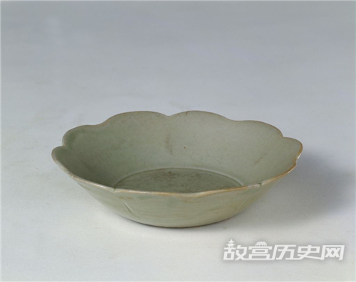碗十花瓣口,口以下渐敛,平底,里外满釉,釉色青绿,如“嫩荷涵露”、“古镜破苔”。