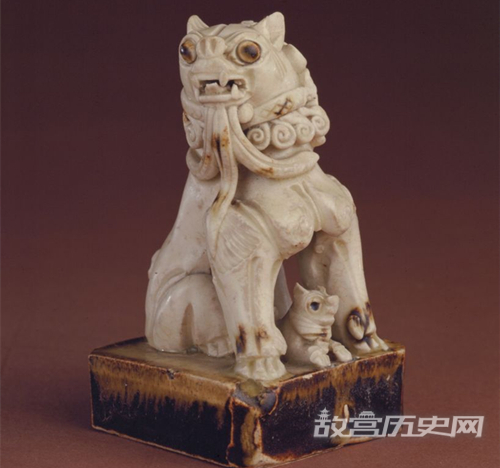 母狮昂首,两眼凸起,双耳直立,张口露齿,长须卷发,前腿直,后腿曲,尾上卷,伏卧于台上。母狮两前腿间有一小狮趴卧。狮身皆施白釉,母子双狮眼睛及母狮腿部均点以褐彩。台为正方体形,四周施褐色釉,浓重处呈黑色。