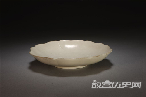故宫馆藏,定窑白釉刻划朵花纹葵花式盘,金,高4厘米,口径20.4厘米,足径8.6厘米。