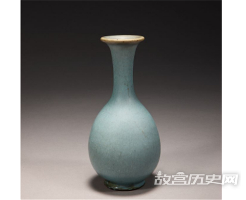 故宫馆藏,钧窑天蓝釉玉壶春瓶,金,高16.7厘米,口径4.8厘米,足径4.7厘米。