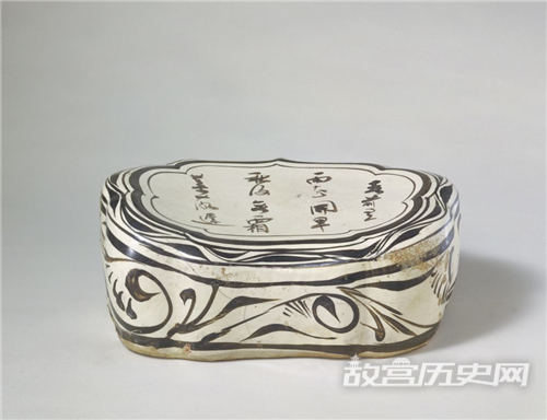故宫馆藏,磁州窑白地黑花诗文如意头形枕,金,高13.2厘米,长31.0厘米,宽22.0厘米。