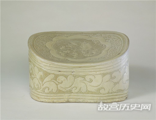 故宫馆藏,白釉剔花花鸟纹枕,金,高17.7厘米,面横30.3厘米,面纵26厘米,底横30厘米,底纵24厘米。