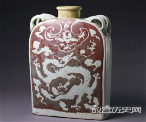 故宫馆藏,釉里红地白花暗刻云龙纹四系扁壶,元,高34厘米,口径8.5厘米,足横26.5厘米,足纵8.2厘米。