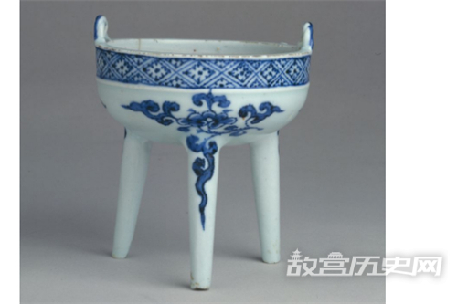 鼎直口,口沿上对称置双耳,浅腹,圜(huán音环)底,下承以三柱状足。通体内外施青白色釉。腹中间凸起弦纹一道。外口下绘青花菱形锦纹,下腹及足绘青花折枝花纹,青花发色艳丽。