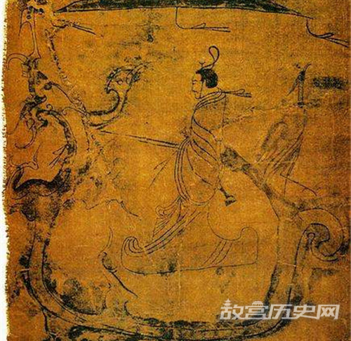 绿松石龙形器尾端下方的绿松石条形饰,当是田地的象征。1973年,湖南长沙子弹库楚墓出土的帛画男子御龙图,是神话传说中乘龙升天的生动写照。值得注意的是,帛画中的飞龙不但“头向西北”,而且在龙的左下方还绘有“鱼形图”。郑玄《礼记·昏义》注:“鱼,水物阴类也。”在古人的观念里,天在上为阳,地在下为阴。故帛画正是用“鱼形图”所表示地下阴界,来映衬男子御龙升天的主题意义。