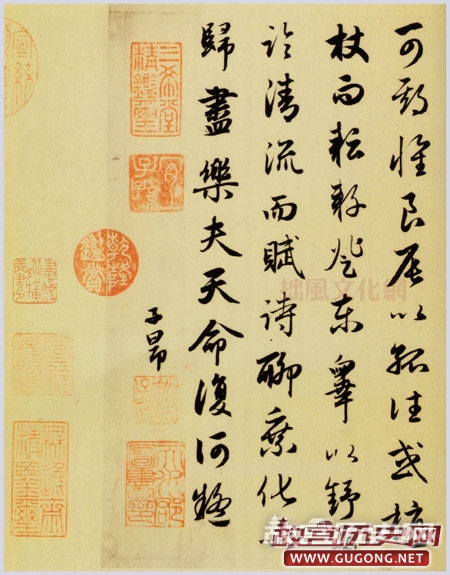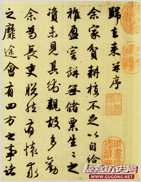 赵孟頫《归去来辞》书法欣赏,大德元年(公元1297年)作。行书,纸本长卷,纵46.7厘米,横453.5厘米。共48行,行10字左右。藏上海博物馆。卷前有其弟所绘陶潜像一幅并有题记,并盖有“古鉴阁中铭心绝品”、“经协久远期无限”、“韵篁馆赏图书“和“秦文钤”等印。