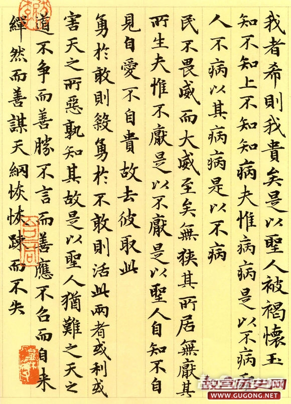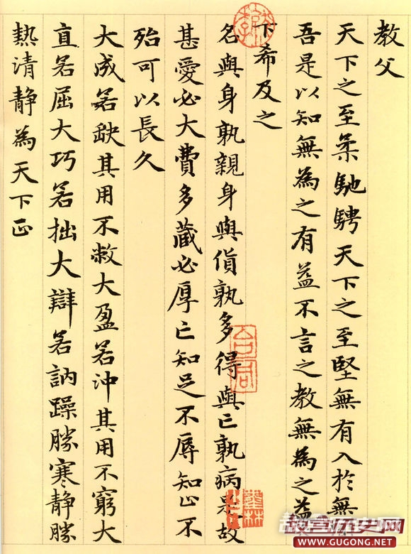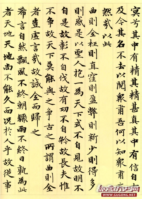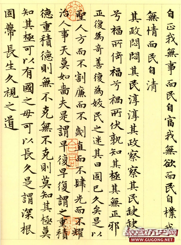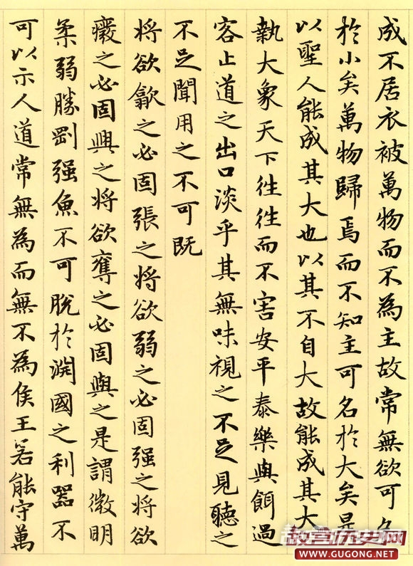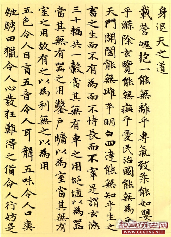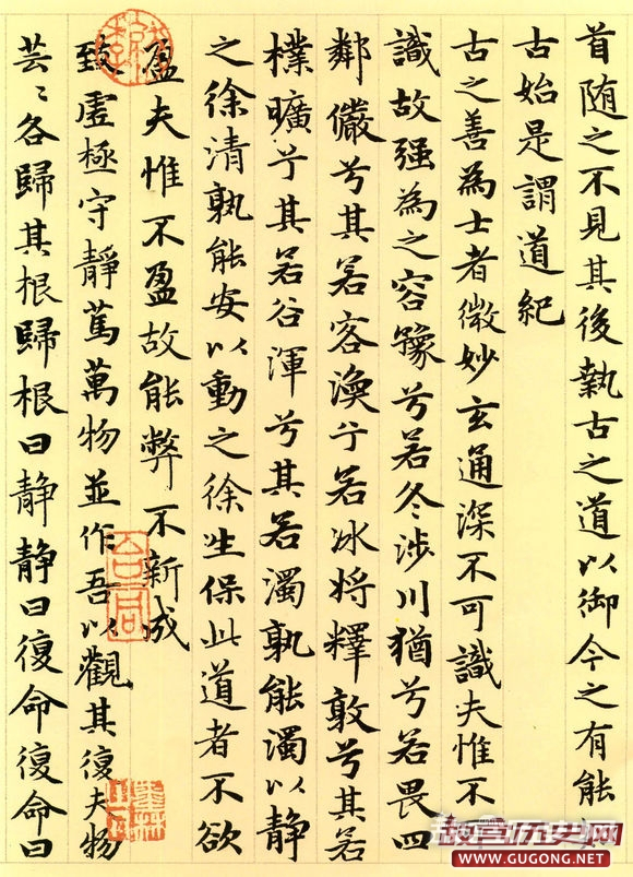 赵氏一生曾多次书写小楷道德经。据方家评介,其晚年书写的这卷长达五千言的小楷,书法结体严谨,笔画精到,精工中透静穆之氮,稳健中露灵动之神,前后风韵一致,堪称其小楷书之精品。本卷墨迹引首为明代著名书家姚绶书写的“松雪书道德经”六个大字,老子画像前有当代著名画家张大千二题。