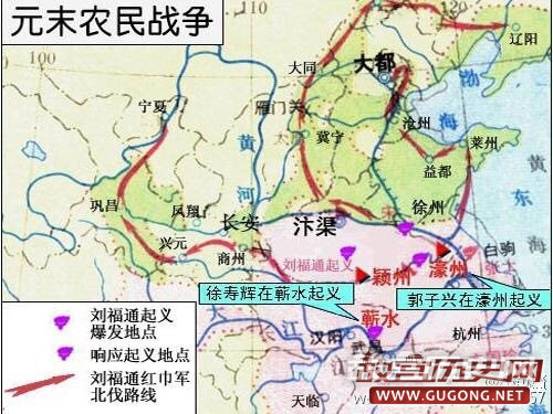 1351年5月28日,(元顺帝至正十一年五月辛亥)颖州刘福通以红巾为号发动起义,很快攻陷颖州,史称“红巾起义”。“石人一只眼,挑动黄河天下反!”