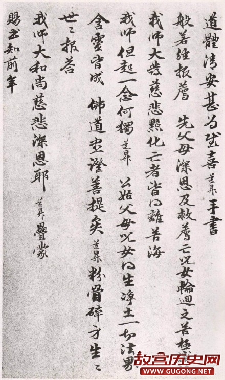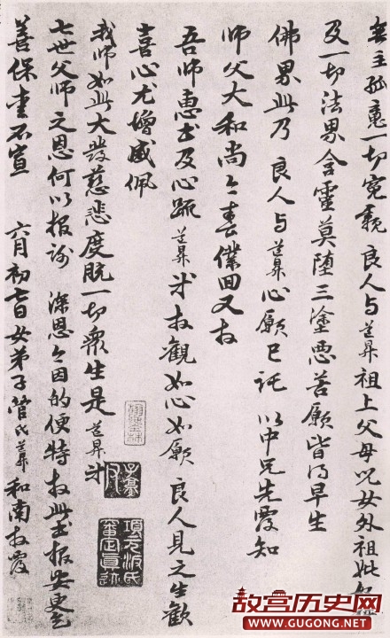 管道昇《与中峰禅师尺牍》纸本31.7×72.9cm 台北故宫博物院藏:此尺牍书风与赵孟頫颇為相近,而运笔结字间时露才女特有的性情。世传管夫人书作“寸縑片纸,人争购之,后学為之模范”。此尺牍款署女弟子管氏道昇和南拜覆,封上鈐有“赵管”一印,此外,幅上有文徵明收藏印二,项元汴收藏印十一,安岐收藏印四。