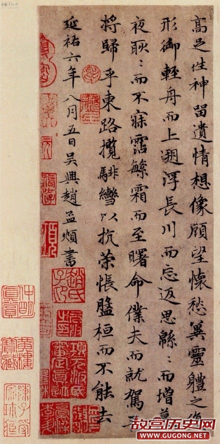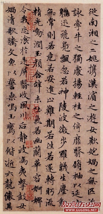 故后纸诸家题跋如是评述此卷,李倜曰:“大令好写洛神赋,人间合有数本,惜乎未见其全。此松雪书无一笔不合法,盖以兰亭肥本运腕而出之者,可云买王得羊矣。”高启云:“赵魏公行草写洛神赋,其法虽出入王氏父子间,然肆笔自得,则别有天趣,故其体势逸发,真如见矫若游龙之入于烟雾中也。”作品本卷共钤印37方,见于清代卞永誉《式古堂书画汇考》、《石渠宝笈》著录。