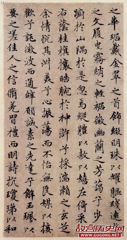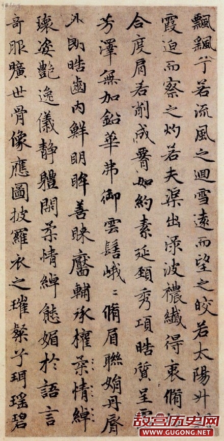 《洛神赋》即为赵氏行书代表作。行中兼楷的结体、点画,深得二王遗意,尤其是王献之《洛神赋》的神韵,即妍美洒脱之风致。如端正匀称的结构、优美潇洒的字姿、圆润灵秀的运笔、密中有疏的布局等;同时,又呈现自身的追求,象比较丰腴的点画,轻捷的连笔,飘逸中见内敛的运锋,端美中具俯仰起伏的气势,都显示出他博取众长而自成一体的艺术特色。