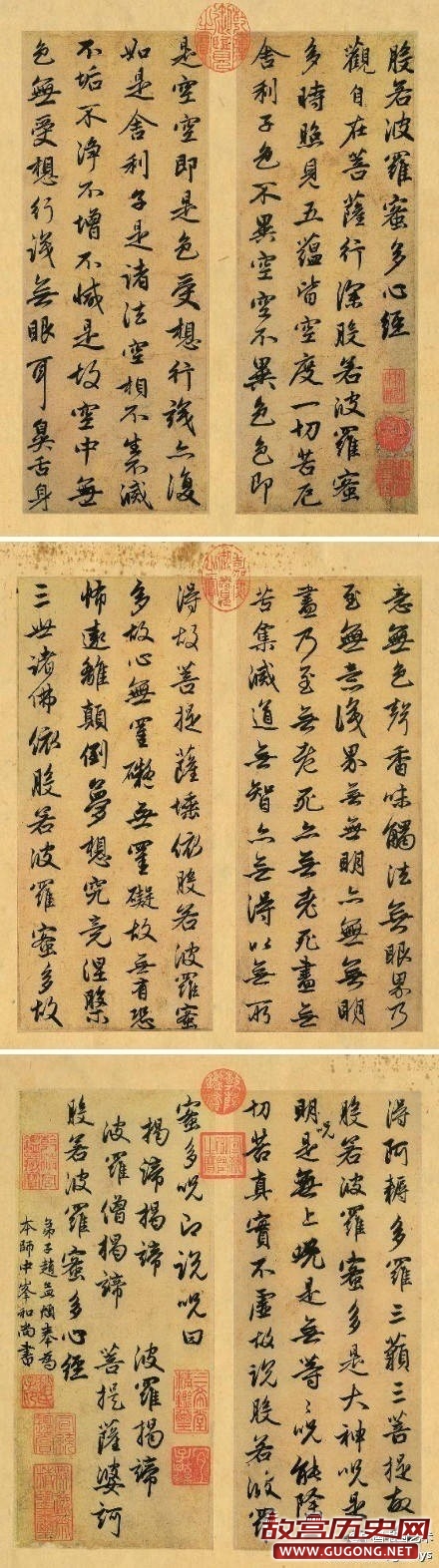 元代赵孟頫《心经行书册》,《心经》乃佛教经典,为释迦佛所讲,由唐僧玄奘所译。此作是赵孟頫的一件代表作品,运笔自如,清润流畅,自成面貌,为历代皇家典藏,原作现藏于北京故宫博物院。