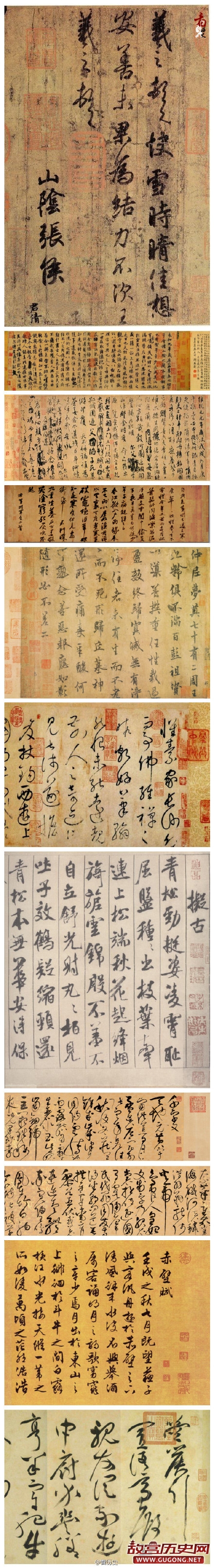 1.王羲之家族《三希宝帖》2.王羲之行书《兰亭序》3.颜真卿行书《祭侄文稿》4.苏轼行书《黄州寒食帖》5.欧阳询楷书《仲尼梦奠帖》6.怀素草书《自叙帖》7.米芾《蜀素帖》8.赵佶《草书千字文》9.赵孟頫楷书《前后赤壁赋》10.祝允明《草书诗帖》