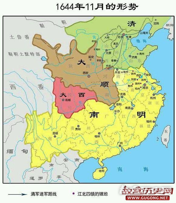 得知李自成被清军击败, 山东河南等地明朝官绅蜂拥而起, 大顺军在这里的政权纷纷瓦解。而清军乘虚南下,到 1644 年十一月清廷已派遣使者兵卒招抚了畿南、山东和河南北部三镇。而在西南,张献忠已攻下成都,收取了四川大部,并于 11 月称帝,建立了大西政权而此时的南明控制范围进一步缩小