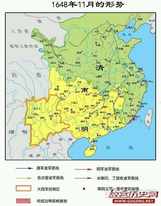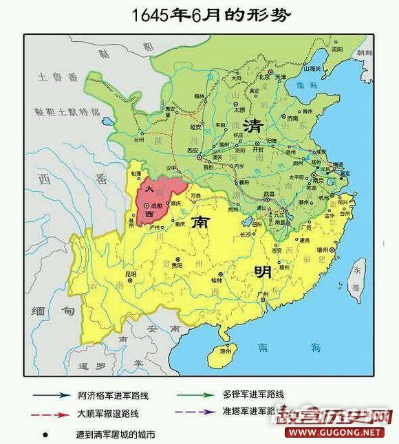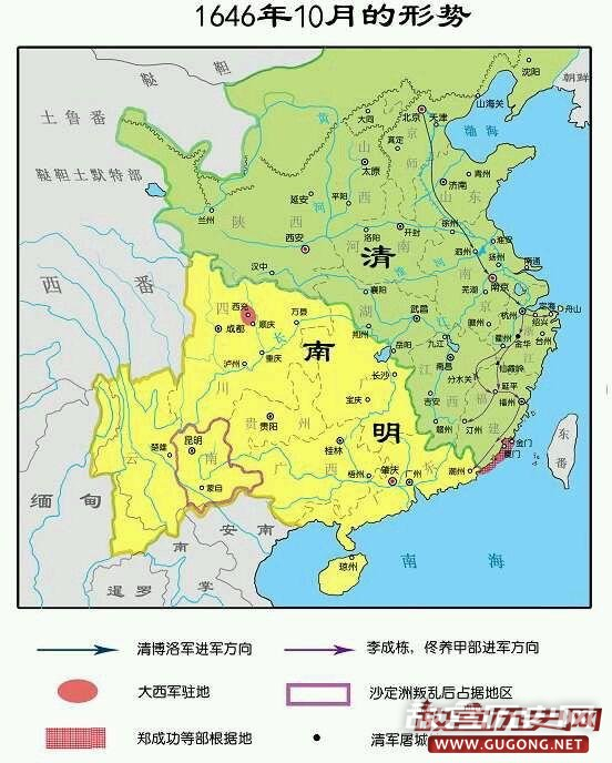在西南,1647 年正月,张献忠被清军射死,清军迅速入川。 大西军余部在孙可望、李定国、刘文秀、艾能奇四将军的率领下急速南撤,渡过长江天险,进入贵州,占领贵阳。豪格统率的清军追至遵义,因地方残破荒芜,粮草不济,只得由四川撤回北京,只在川北据有保宁一隅之地。