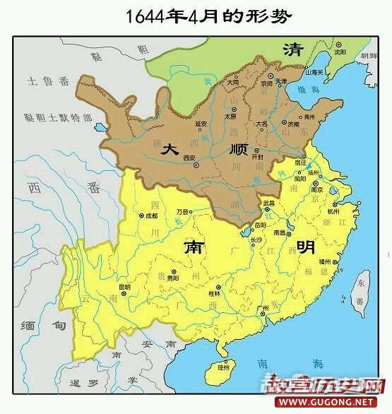 1644 年,李自成进入北京。此时大顺军势力已东至鲁豫,南跨荆楚,西迄秦陇,北抵燕晋,整个北方几乎皆为其所有。南明只控制了江淮、江南和西南大部分地区。而在西边的四川, 此时张献忠领导的另一支农民军正屯兵万县, 准备向成都进发。