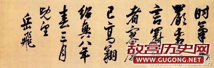 岳飞是我国历史上一位杰出的民族英雄。虽出身军伍,但文武双全,能诗善词,书法以行、草为主,传世书迹,有《书谢眺诗》、《前后出师表》、《还我河山》等。