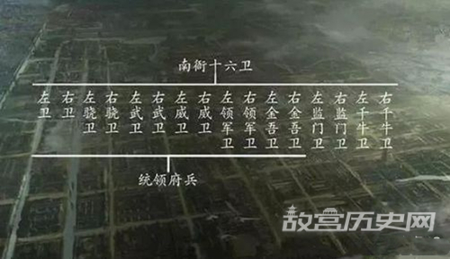 因为十六卫官署在皇宫之南,所以史称“南衙府兵”;“南衙府兵”,与守卫皇宫北门﹑由招募配充的兵士组成的“北衙禁军”交错宿卫,相互牵制。