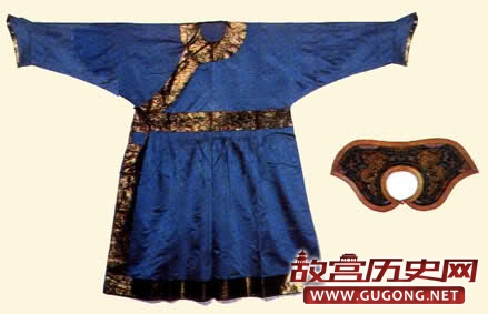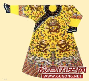 皇帝的龙袍属于吉服范畴,比朝服、衮服等礼服略次一等,平时较多穿着。穿龙袍时,必须戴吉服冠,束吉服带及挂朝珠。龙袍以明黄色为主也可用金黄杏黄等色。古时称帝王之位,为九五之尊。九、五两数,通常象征着高贵,在皇室建筑、生活器具等方面都有所反映。清朝皇帝的龙袍,据文献记载,也绣有九条龙。从实物来看,前后只有八条龙,与文字记载不符,缺一条龙。有人认为还有一条龙是皇帝本身。其实这条龙客观存在着,只是被绣在衣襟里面,一般不易看到。这样一来,每件龙袍实际即为九龙,而从正面或背面单独看时,所看见的都是五龙,与九五之数正好相吻合。另外,龙袍的下摆,斜向排列着许多弯曲的线条,名谓水脚。水脚之上,还有许多波浪翻滚的水浪,水浪之上,又立有山石宝物,俗称“海水江涯”,它除了表示绵延不断的吉祥含意之外,还有“一统山河”和“万世升平”的寓意。