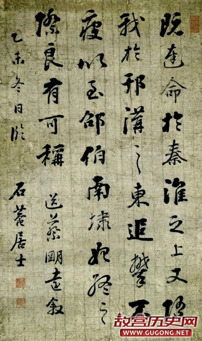 书画作品中,作者本人的署款和题记是借以表明此件作品是自己的亲笔,以取信于人,它是书画鉴定的重要依据。但后人可以将款题进行拼配,真书画配假款层出不穷。代笔书画往往又是书画假款真,故使书画中款题的鉴定作用降低。款题又是假手下功夫最多的地方,因此牢记作者的不同款题,是非常重要的一环,刘墉的书法也是如此。谈到刘墉的名款,见于记载的有“刘墉”、“石庵”、“日观峰道人”、“石盒”、“木庵”、“青原”、“香岩”、“东武”、“溟华”等。见于传世作品中的有“刘墉”、“石盦”、“石庵弟墉”、“石庵刘墉”、“石庵居士”、“晚香堂刘墉”、“弟墉顿首”、“日观峰道人书”、“刘墉志”、“石庵书旧句”、“十一兄墉”、“臣刘墉敬书”等。这些署款,不仅是刘书鉴定的重要依据,而且是研究刘墉书法和生平的重要史料,比如“十一兄墉”,说明刘墉兄妹多,他排行第十一。又如“臣刘墉敬书”,说明他是宫廷书家。