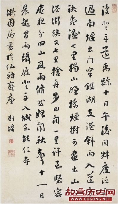 晚年,约70岁以后,书法北朝碑版,正如《书林藻鉴》引《艺舟双楫》所云:“文清(刘墉)……七十以后,潜心北朝碑版,虽精力已衰,未能深造,然意兴学识,超然尘外。”又说“盖山东多北魏碑,能见六朝真相,此诸城(刘墉)之所以或过华亭者”。代表作品有作于1797年刘墉79岁时的《行书轴》。此书纸本,墨迹,款署“嘉庆丁巳二月,刘墉”。钤“御赐海岱高门第”、“刘墉印信”等印,该书体丰肥骨劲,结体严谨而又舒展,为刘墉79岁时精作。