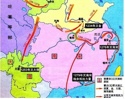 1273年,元军攻破围攻了5年的襄阳(如下图绿圈);