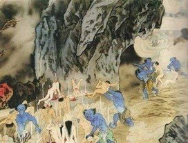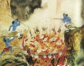 卖淫嫖*,盗贼抢劫,欺善凌弱,拐骗妇女儿童,诬告诽谤他人,谋占他人财产,妻室之人,死后打入油锅地狱,剥光衣服投入热油锅内翻炸,啪,啪直响!依据情节轻重,判炸N遍...有时罪孽深重之人,刚从冰山地狱里出来,又被小鬼押送到油锅地狱里暖和暖和。此为上九层,即东地狱,虽叫法与酆都略有不同,可见地狱何其多也,并非董某手误。而《水陆全图》中的下九层的西地狱,则更为残酷...