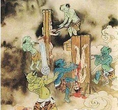 偷工减料,欺上瞒下,拐诱妇女儿童,买卖不公之人,死后将打入刀锯地狱。把来人衣服脱光,呈大字形捆绑于四根木桩之上,由裆部开始至头部,用锯锯毙