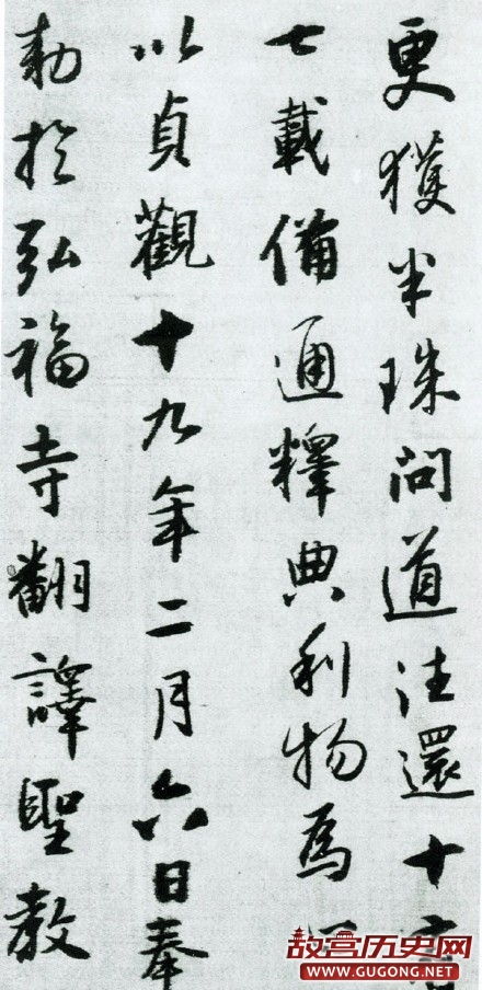 以贞观十九年九月六日,奉敕于弘福寺,翻译圣教要文,凡六百五十七部。引大海之法流,洗尘劳而不竭;传智灯之长焰,皎幽闇而恒明。自非久值胜缘,何以显扬斯旨!所谓,法相常住,齐三光之明;我皇福臻,同二仪之固。