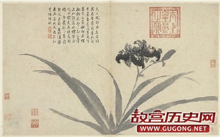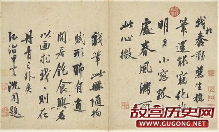 前副叶第一开沈周六十八岁自题云:“我于蠢动兼生植,弄笔还能窃化机;明日小窗孤坐处,春风满面此心微。戏笔此册,随物赋形,聊自适闲居饱食之兴。若以画求我,我则在丹青之外矣。弘治甲寅(一四九四)。沈周题。”用笔洒脱不羁,虽见黄庭坚书风影响,但已呈现个人面目。