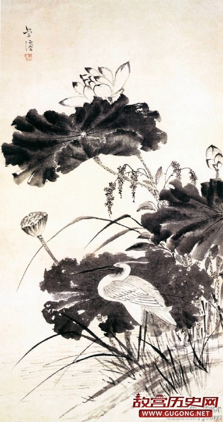 《荷花鹭鸶图》,图中碧荷舒卷如云,一白鹭曲颈缩首,正在岸边草丛中闭目休憩。画家以泼墨写出荷叶,以重墨勾筋描络,写中带工;双钩写荷花,璎珞飘摇。白鹭近似白描,不加晕染却生动准确。整幅画清新明快,是一幅写意佳作。上海博物馆藏品。