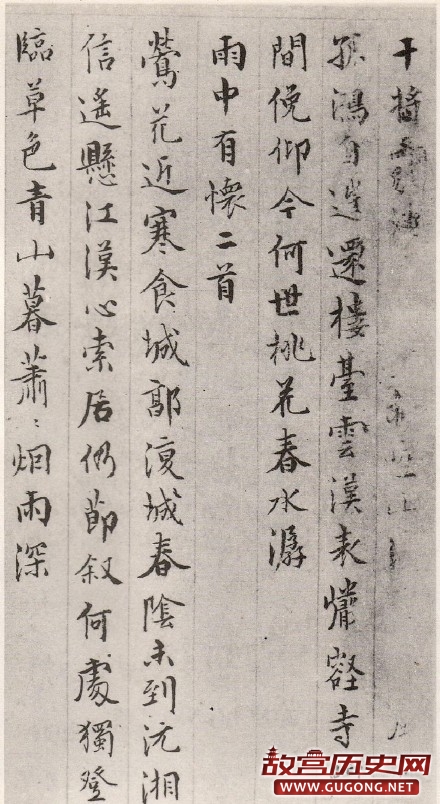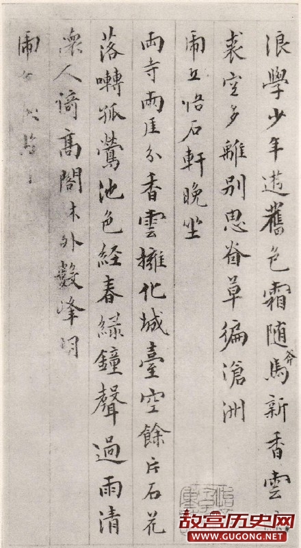 居节楷书《诗稿册页》,卷首有残损,改装成册页14页,末页空白。纸本乌丝栏小楷书,纸高22.7厘米,横12厘米。残存诗21首,内五律11首,两首有残损,七律十首。此作未见著录,尾题“呈太常袁相公刊定,壬申(1572)三月一日居节顿首上”。左二印,上白文“成节印”,下朱文“士贞父”三字平列。时居节46岁,画、诗、书俱臻成熟佳景。