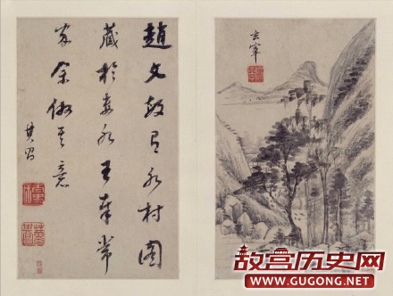 董其昌山水画册:10开均为山水小品,山、水、树、云等元素经由董氏不同的笔法、造型、布局幻化为各具风韵的山水佳作。每开的画法均由对题点明,以仿元代大师的技法为主,如第六开,仿赵孟頫画法,并且具体到仿赵氏《鹊华秋色图》卷中“华不住山”的笔法,显示了董氏深厚的仿古功力。