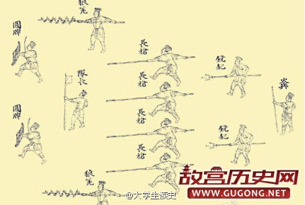 为抗击倭寇,戚继光发明鸳鸯阵。队长一人,再二人一执长牌、一执藤牌。再二人为狼筅手执狼筅,掩护盾牌手的推进和后面长枪手的进击。接着是四名手执长枪的长枪手,再跟进是两个手持“鎲钯”的士兵担任警戒、支援等工作。最后一名是火兵。此阵攻守兼备,成为克制倭寇的利器。