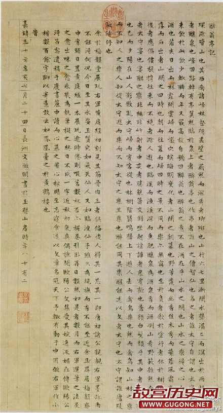 明代文徵明《醉翁亭记》,纸本,纵53.5cm,横28.6cm。台北故宫藏。此贴是文徵明八十二岁时书写,全文精整挺秀,铁画银钩。书后有长跋,谈到当时书法上的体验与书欧阳修“醉翁亭記”的原由。欧阳修从韩愈的文章得到启发,文徵明也希望从钻研王羲之的书迹中,追求如不食人间烟火,冰清玉骨的感受。