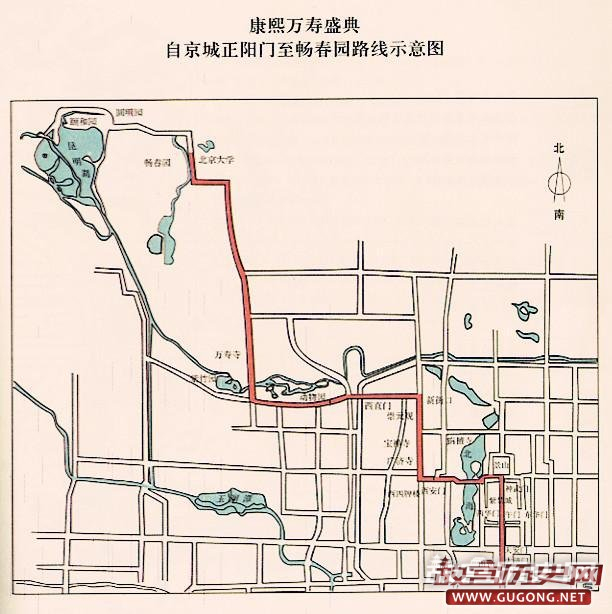 京师的康熙皇帝六旬万寿庆祝活动,安排得有条不紊。从皇城正门正阳门、大清门、天安门,到皇宫正门午门,历紫禁城东华门、西华门、神武门到紫禁城北的御园景山,然后到景山西的御海北海,经旃檀寺、西安门、西四牌楼、广济寺、宝禅寺、新街口、崇元观,过西直门、万寿寺、畅春园、圆明园达到颐和园。一路上张灯结彩、歌舞升平,锦坊彩亭星罗棋布,彩棚相望,满眼火树银花、一派欣欣向荣的欢庆景象。