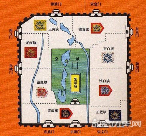 内城:内城以元大都城改建而成,面积是35.57平方千米。清朝以北京为都后,内城不能居住汉人,汉人必须迁往外城,内城只准八旗官兵和家眷、从属居住。八旗各居在不同的区域,拱卫皇城,到了中后期,不同旗人居住的界限被打破。而从顺治开始,部分汉人大臣也被允许居住在这里。不过内城的人口依然被严格控制,一般保持在四十万左右。