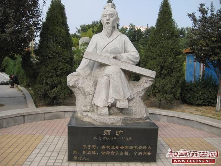他生而无目,故自称盲臣、瞑臣。为晋大夫,亦称晋野博学多才,尤精音乐,善弹琴,辨音力极强。以“师旷之聪”闻名于后世。他艺术造诣极高,民间附会出许多师旷奏乐的神异故事。南师店村有师旷墓遗址。