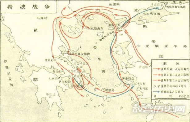 希波战争从公元前492年开始,公元前449年止,大体分作两个阶段:前期(至公元前479年)为波斯的进攻阶段,后期(公元前479年以后)为希腊人的反攻和相持的阶段。