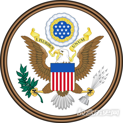 鹰的两爪分别抓着橄榄枝和箭,象征和平和武力,鹰嘴叼着的黄色绶带上用拉丁文写着“合众为一”,意为美利坚合众国由很多州组成,是一个完整的国家。