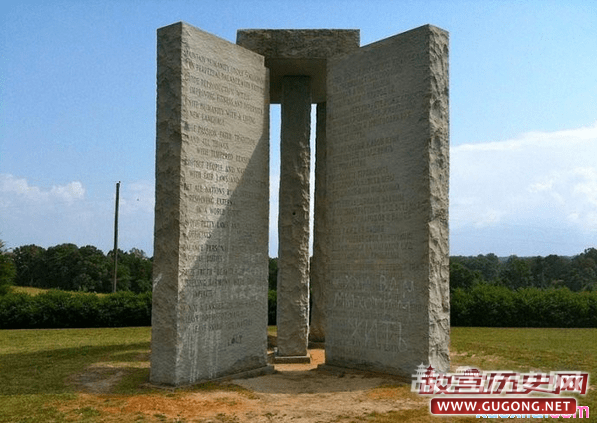 四块巨石有八个正面,上面铭刻文字。这座巨石碑上用12种语言:英文、俄文、希伯来文、阿拉伯文、印度文、中文繁体、西班牙文、斯瓦西里文铭刻了所谓的”新“人类文明宣言。