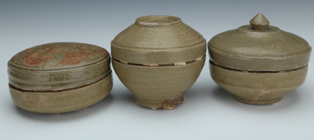 盒按盖面分高隆弧形、浅弧形、平顶形,按纽分有无纽、环形纽、宝珠纽,按口分有直口、折敛口,按腹分有浅直腹、浅弧腹、深弧腹,按底分有平底、高矮不一的圈足等,是最丰富的器型之一。
