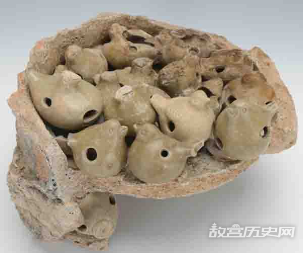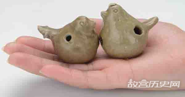 鸟形器造型基本相同,仅在细部有所区别:昂首、小喙、小圆眼,胖圆鼓腹,头腹几乎边成一体,小尾上翘,在前胸、腹中部两侧各有一个小孔。应该是玩具类器物。